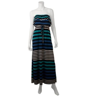 Dresses. Cool and blue, this multi-striped dress from A. Byer gives the sweetest details of ruffled, tied belts and long length for a cute, casual look. Featured in blue multi Strapless Tiered top Blouson style Tied waist Striped allover Smocked at waist Maxi length Polyester/rayon/spandex Imported