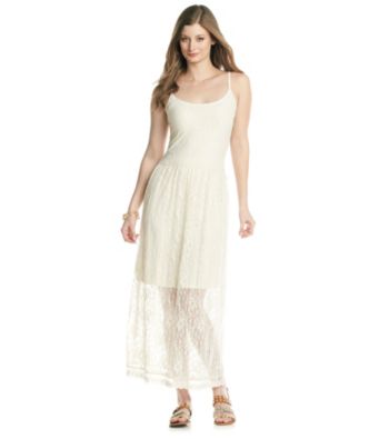 Dresses. Soft and elegant, this adorable maxi dress from Chelsea & Theodore features sweet lace allover with a sassy, sheer bottom. Featured in ivory Scoopneck Adjustable straps Pullover style Small back zipper Keyhole closure Long length Sheer lace hem Lace allover Short dress lining Nylon/spandex Imported