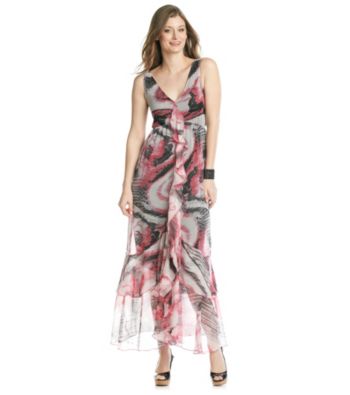 Dresses. Fun and flirty, this flowing and feminine maxi dress features and allover print and a cascading front ruffle. Featured in black/pink Sleeveless V-neck Smocked back Ruffle detail down front Maxi length Lined Pullover Polyester Imported
