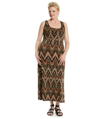 Dresses. Give your look an ethereal edge with this maxi dress from Notations that features an allover print and a scoopneck. Featured in brown multi Sleeveless Scoopneck Empire waist Allover zig-zag print Polyester/spandex Imported