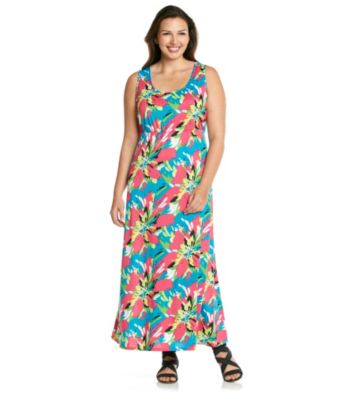 Dresses. Bright and bold, this maxi dress from Notations features an allover floral print along with a scoopneck. Featured in wildflower Sleeveless Scoopneck Seamed waist Allover floral pattern Polyester/spandex Imported