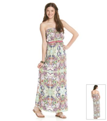Dresses. Lively and fun, this dress from Trixxi features a flirty, paisley print with ruffled top and a belted maxi look that is irresistible. Featured in pink multi Strapless Ruffled trim at bust Braided belt Elastic at waist Paisley print allover Maxi length Cotton/polyester Imported