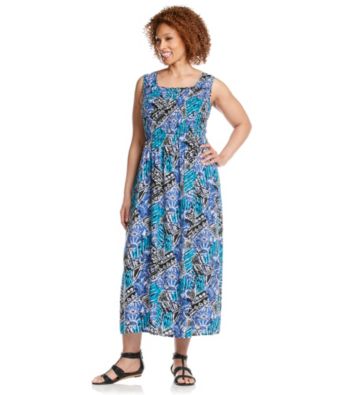 Dresses. This maxi dress from Notations features a smocked bodice along with an allover, ethereal print. Featured in remarkable Sleeveless Squareneck Smocked bodice Maxi length Pullover Printed allover Rayon Imported