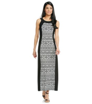Dresses. Elegant and elongating, this slimming maxi dress from R & M Richards features a summery, ringer neckline and fun printed panels on the front and back. Featured in black/white Ringer neckline Sleeveless Maxi length Front and back printed panel Back zipper Polyester/spandex Imported