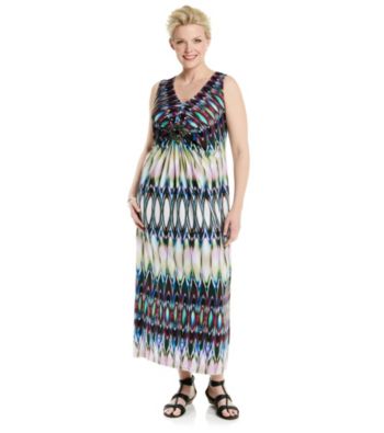 Dresses. Long and lovely, this maxi dress from R & M Richards features a unique, colorful print allover and a jeweled brooch at the center. Featured in multi V-neck Sleeveless Jeweled brooch at center Allover print Pullover style Polyester/spandex Imported