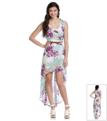 Dresses. Have a little fun and take paradise with you everywhere in this floral maxi from Sequin Hearts that features a high-low hem, cutout details and a belted waist. Featured in floral combo Scoopneck Sleeveless Double strap detail Cutout in back Belted waist Allover floral print High-low Maxi length Polyester Imported